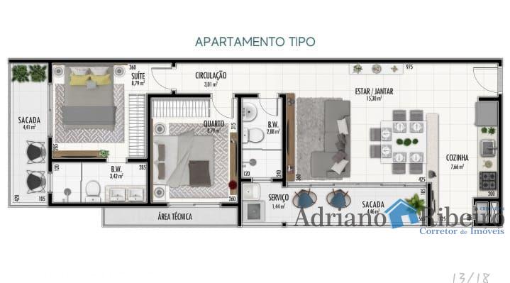 2 quartos, sendo 1 suíte, Bwc social, área de serviço